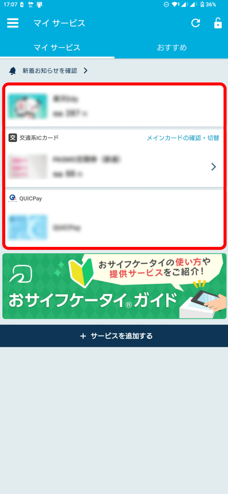 おサイフケータイアプリをタップし、「マイサービス」を確認。