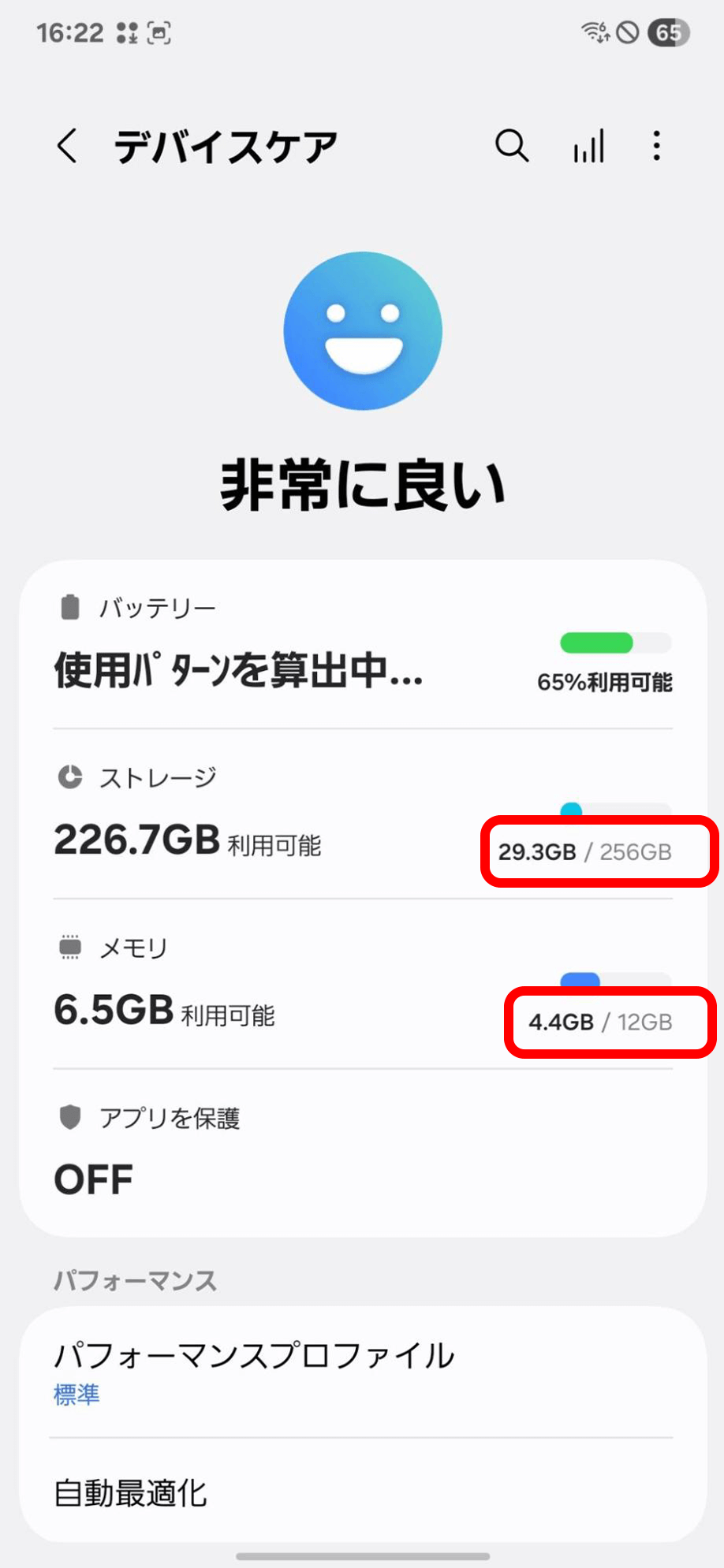 「デバイスケア」の「ストレージ」と「メモリ」の分母を確認する