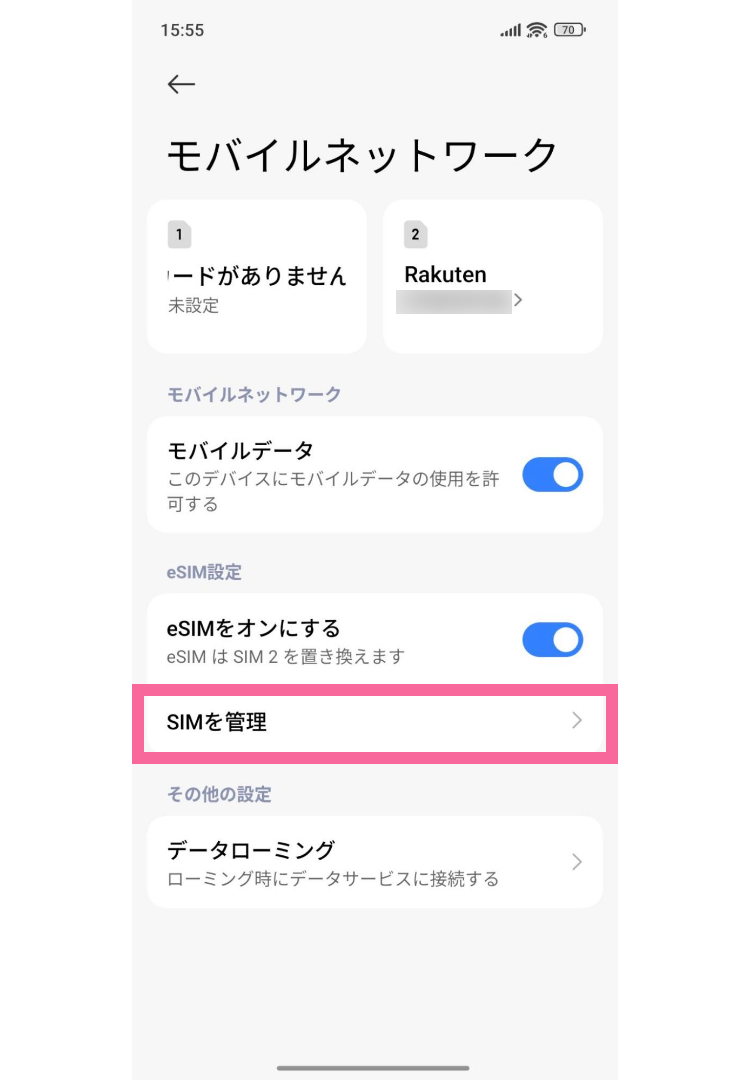 「モバイルネットワーク」から「SIMを管理」をタップ