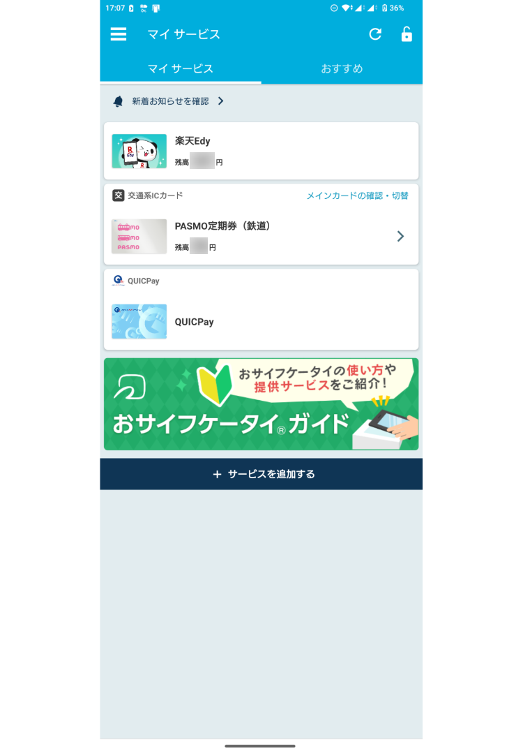 おサイフケータイアプリをタップし、「マイサービス」を確認