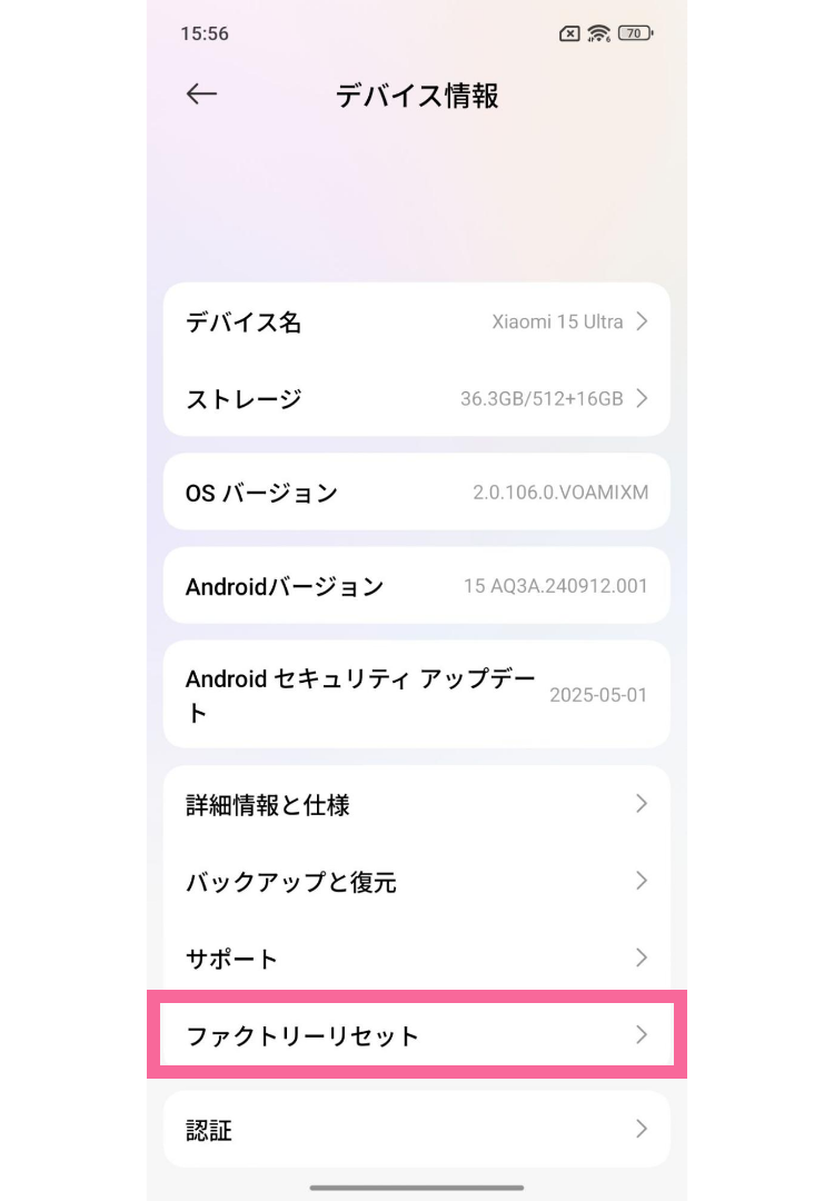 「デバイス情報」から「ファクトリーリセット」をタップ