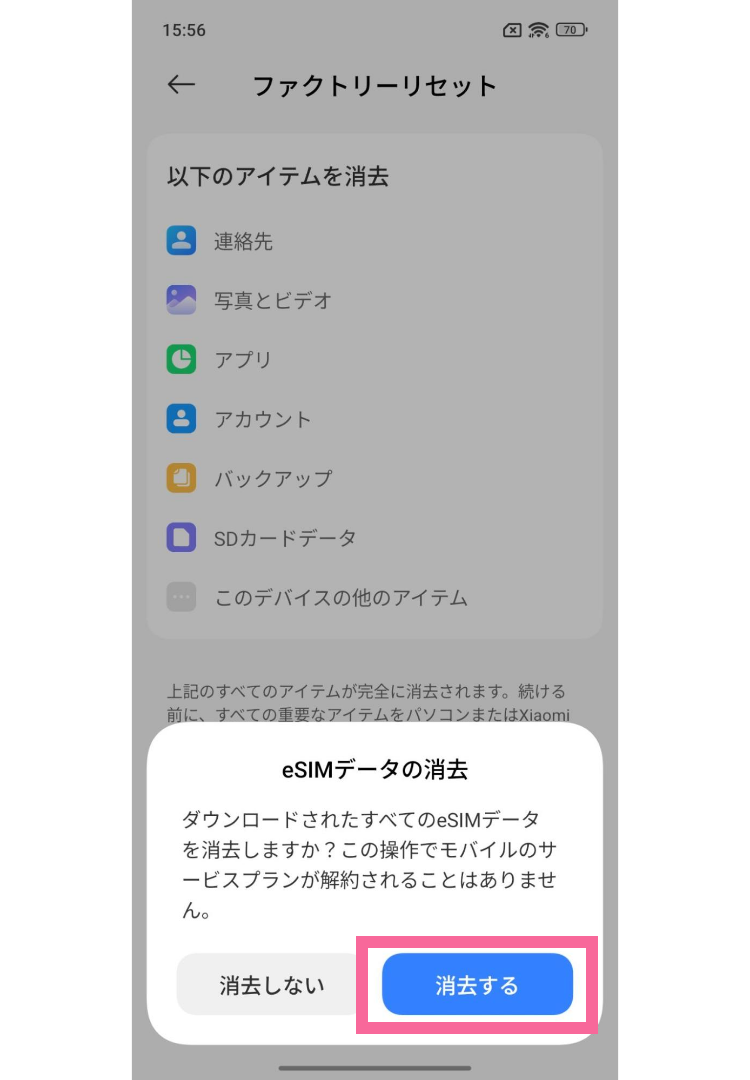 つづいて、「eSIMデータの消去」のポップアップが表示されるので「消去する」をタップ