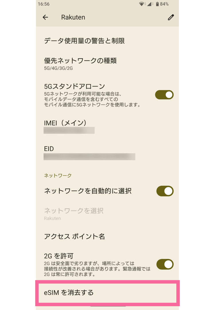 そのため、「eSIM」を使っている場合は「eSIM設定の削除」から、